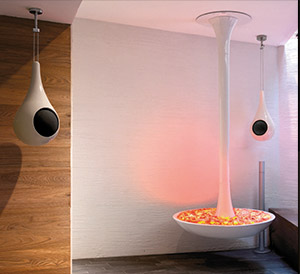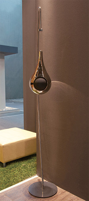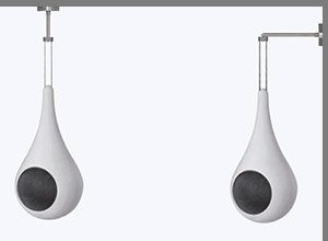 Tropfenformiger Lautsprecher – das in Handarbeit gefertigte Gehäuse aus Keramik kann an Decke oder Wand abgependelt werden. Eigens ein formschöner Ständer ermöglicht die freie Aufstellung im Raum.
